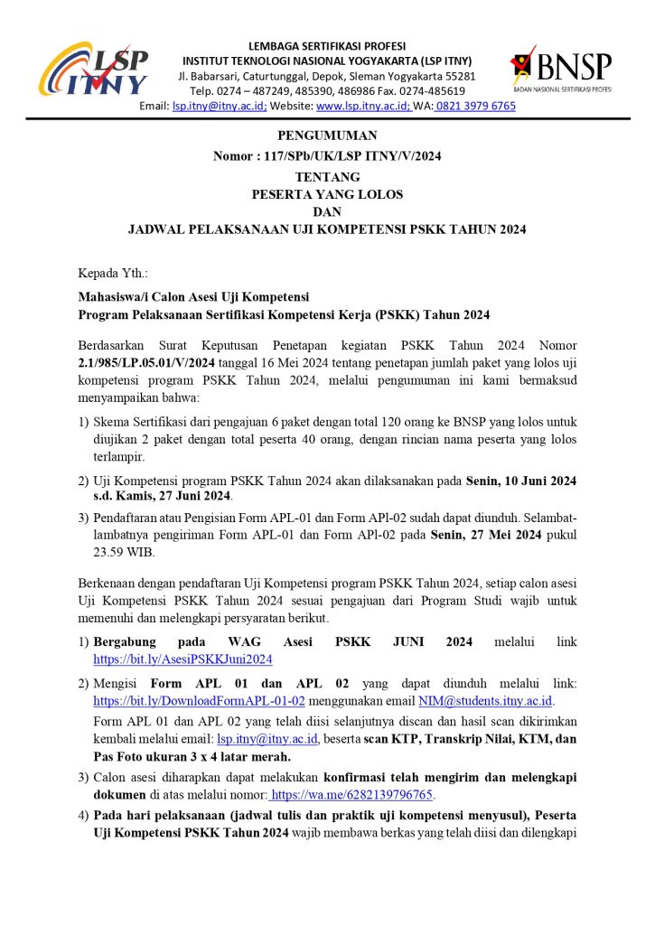 Melalui surat ini, disampaikan nama-nama peserta Uji Kompetensi yang lolos seleksi PSKK 2024 dan dapat melanjutkan ke Tahap Asesmen (daftar nama terlampir). Adapun pelaksanaan Uji Kompetensi akan dimulai pada Bulan Juni 2024 (jadwal terlampir). Demikian kami sampaikan surat ini dengan sebenar-benarnya. Semoga dapat menjadi manfaat bagi peserta Uji Kompetensi. Atas perhatian dan kerjasamanya, kami mengucapkan terimakasih.